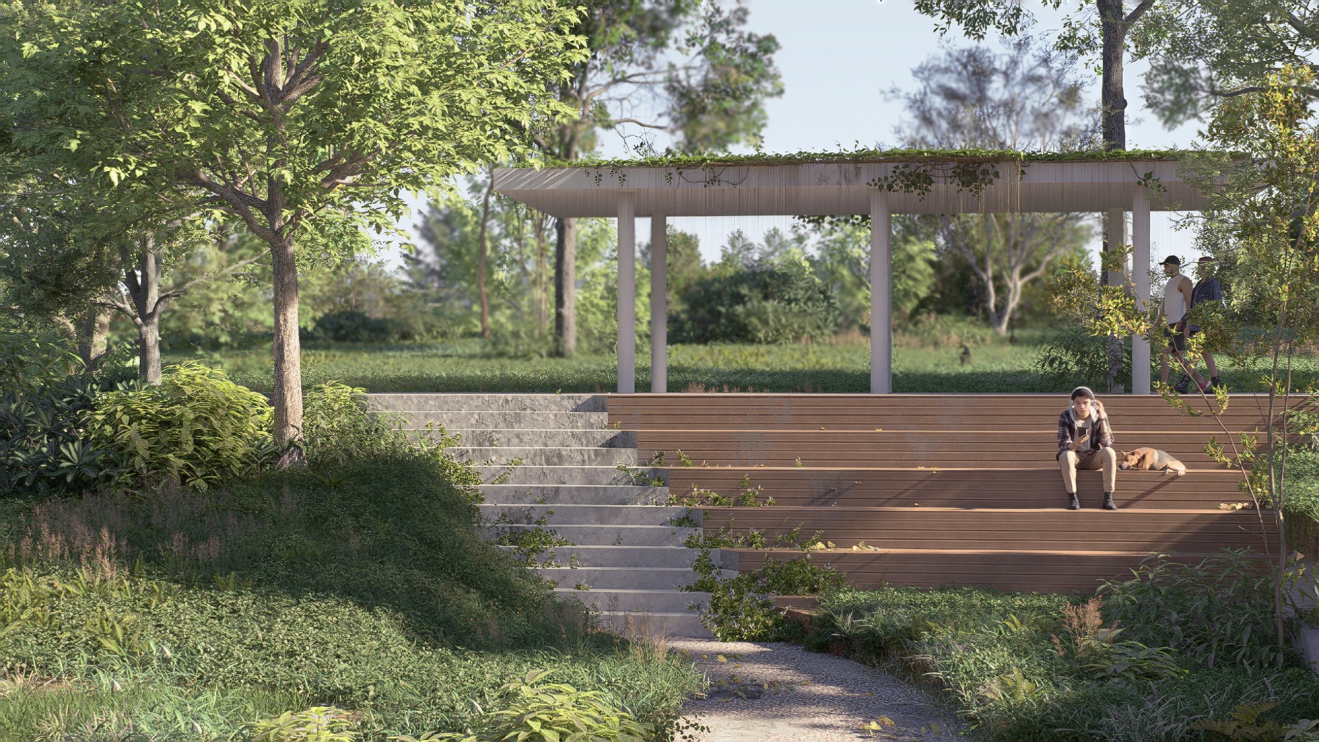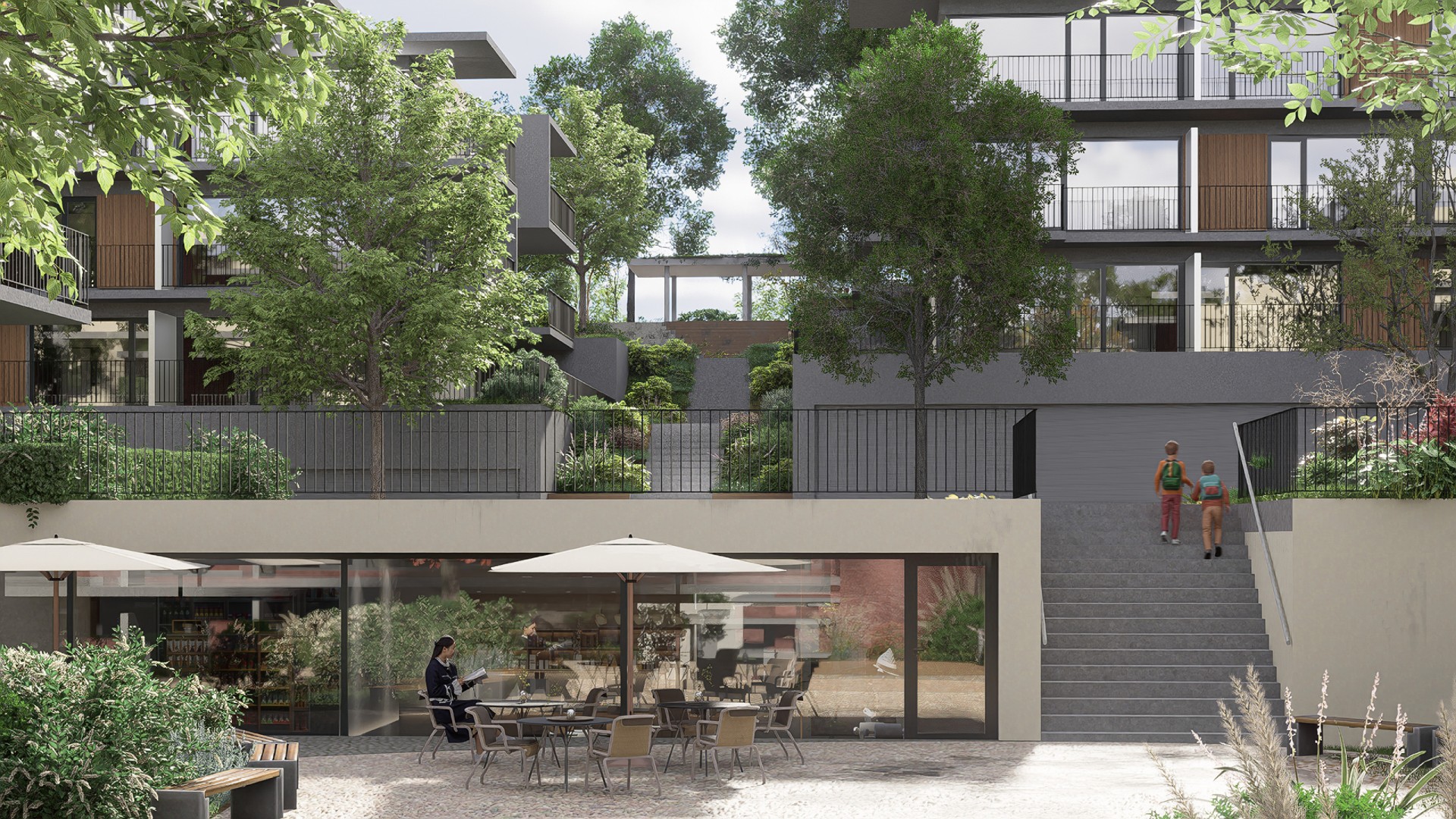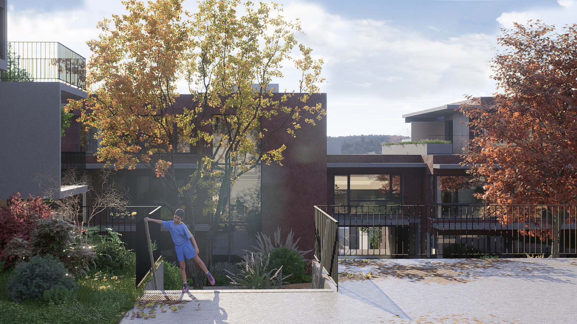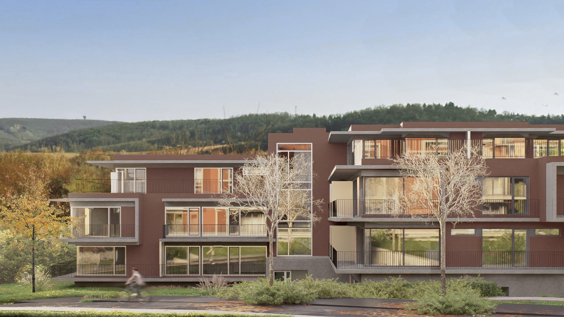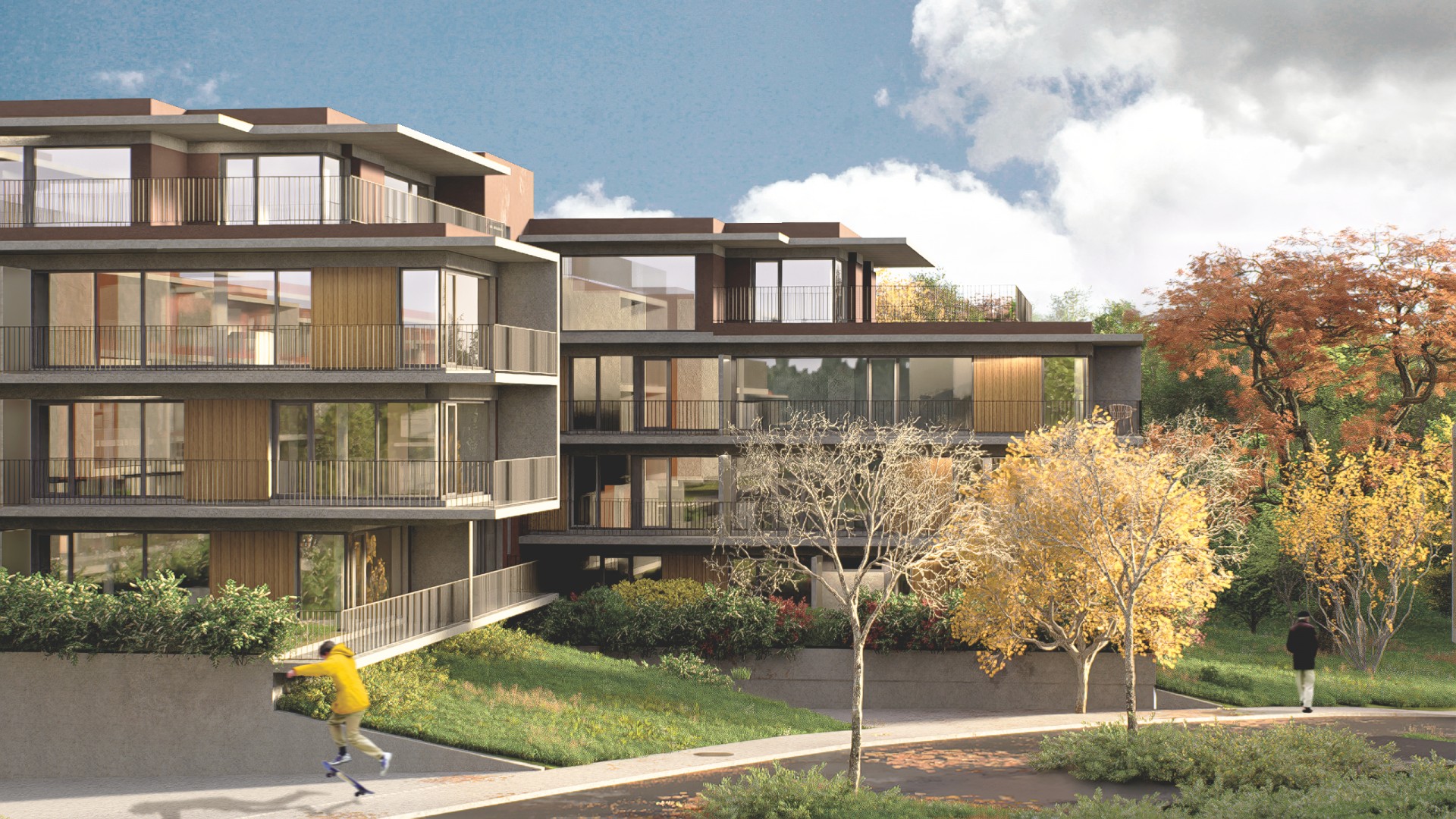 Navrhované bytové domy na jižním svahu severovýchodně od centra Brna-Žebětína jsou přístupné z ulice Jerlínka a dvou nových, stromořadím lemovaných komunikací. Tři paralelně řazené nízkopodlažní objekty (3 + 1 ustupující podlaží) vytvářejí otevřenou, vzdušnou strukturu. Mezi dvěma řadami vzniká vnitroblok s předzahrádkami a komunitním prostorem na křížení hlavních pěších tras. Výškové osazení reaguje na terén; do domů se vstupuje z vyšší ulice, zatímco obytné fasády s předzahrádkami směřují do nižší části pozemku, což chrání soukromí přízemních bytů. Horizontální členění, balkony a ustupující podlaží zjemňují měřítko, okenní rytmus dotváří fasády. Zeleň v ulicích, vnitrobloku i na střechách přirozeně začleňuje projekt do okolní krajiny a zvyšuje kvalitu bydlení.
